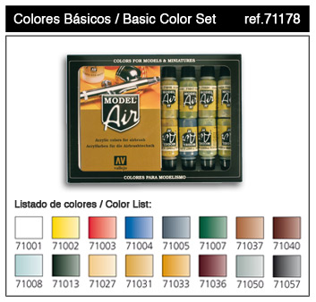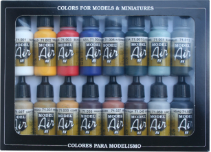 Colección de estuches de 16 colores Model Air para pintar maquetas y miniaturas. Cada uno de los estuches tiene una selección de colores especiales para pintar vehículos, figuras, etc. Contienen 16 botellas de 17 ml. (con cuentagotas) y una carta de colores.